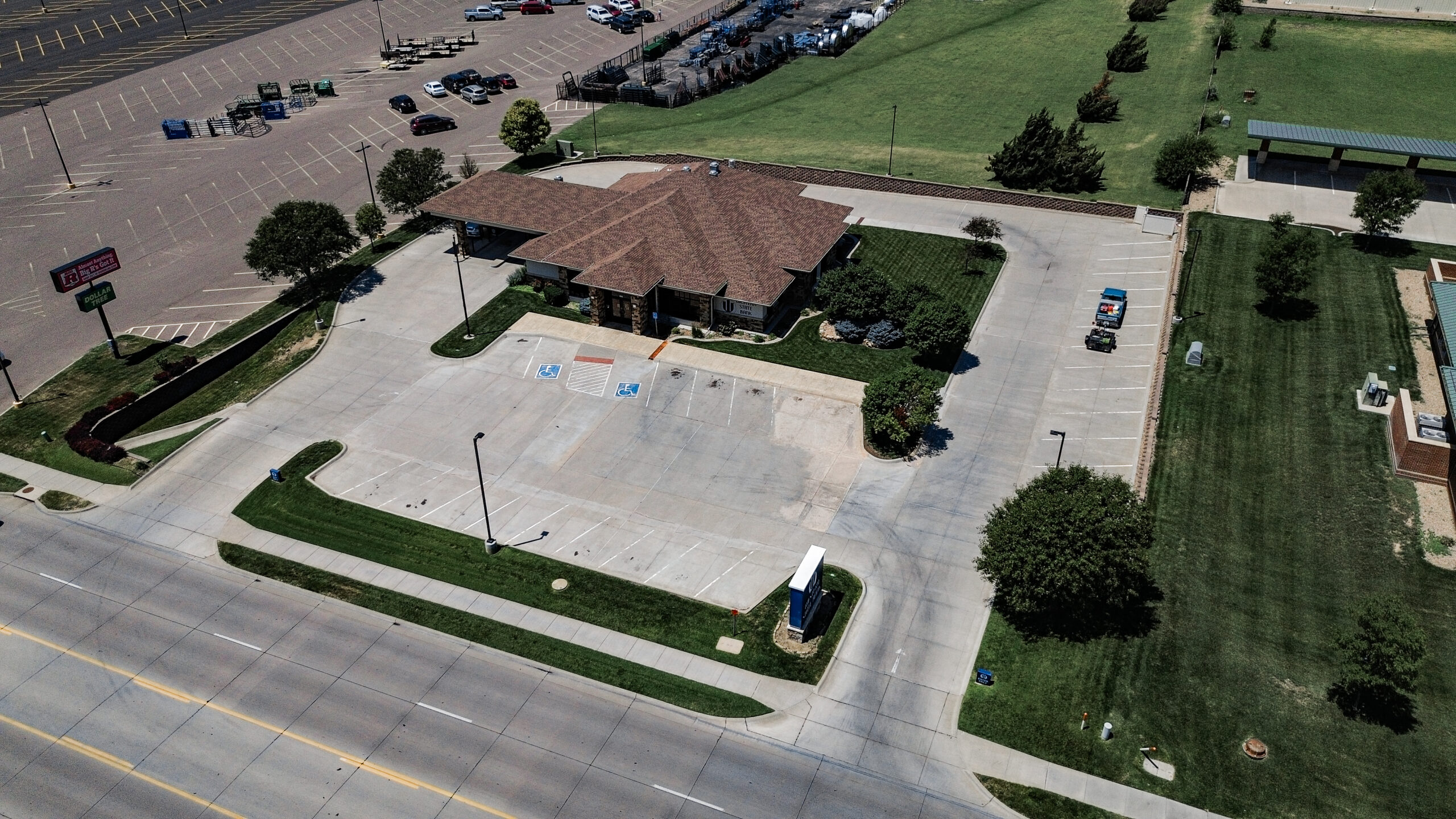 Western State Bank in Dodge City hired the Pro Stripe Parking Lot Maintenance crew to refresh their concrete drive lanes and parking lot with pressure washing, crack filling, and restriping.